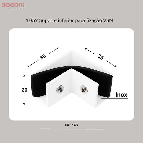 O suporte 1057 é uma peça inferior desenvolvida para unir e fixar dois vidros em ângulo de 90°. Ideal para montagem de cantos em boxes, divisórias, vitrines ou painéis fixos de vidro temperado, oferecendo alinhamento preciso, firmeza estrutural e acabamento de qualidade.